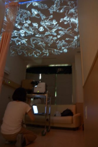 病院側が空いている個室をご用意くださり、天井への投影準備が完了。ご両親と一緒にバギーに乗ってきたKちゃんは軽く手を振ってプラネタリウムのお部屋へ入ってくれ、ソファベッドに横たわって投影がスタートしました。しばらくして少し退屈になったKちゃん。廊下へのお散歩がしたくなり、一旦休憩をはさんで投影を再開しました。