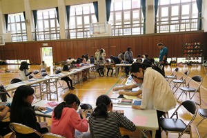 保護者の方や高学年の児童が手伝ってくれて、みんな時間内に作品をしあげることができました。自分の作品ができると、遮光ビニールで覆われた試写コーナーに持ち込んで、そちらもで「オー」という歓声があがっていました。